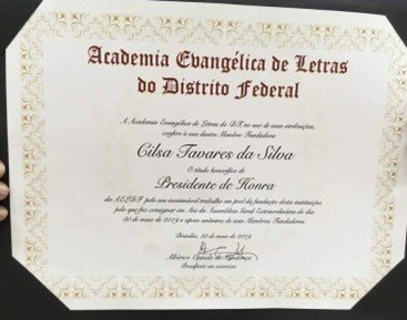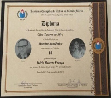 Cilsa Tavares é formada em Letras pela UNICEUB e Pós-graduada em Metodologia da Língua Portuguesa; Bacharel em Teologia. É Mentora, Sócia Fundadora e Presidente de Honra da Academia Evangélica de Letras do DF, onde ocupa a Cadeira n°18 como membro Titular. Quando criança conheceu o mundo da leitura com Monteiro Lobato, depois vieram os clássicos: Machado de Assis, José de Alencar e outros. Aos 15 anos, leu a Bíblia Sagrada de Gênesis ao Apocalipse. Enquanto professora da Secretaria de Educação do DF, desenvolveu projetos de incentivos à leitura, dentre eles, O Despertar Poético, com participação de escritores de Brasília. O resultado foi a produção de antologias escritas por alunos. Autora da obra “A Enfezada Melissa”, publicada em 2019. Participou da I Antologia da Academia Taguatinguense de Letras, em 2017 e da obra “Vidas que Ainda Falam”, publicadas em 2019 pela AELDF. É Incentivadora Cultural e Cristo é o Centro de sua vida.