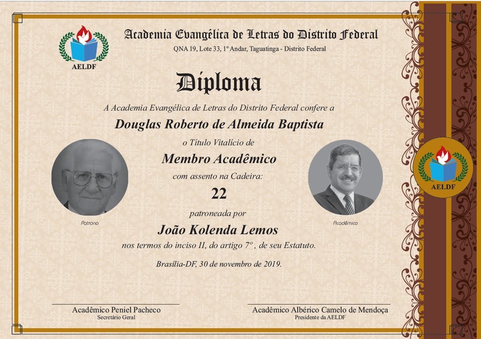 O acadêmico Douglas Baptista é também oficial do Exército Brasileiro oriundo da Arma de Comunicações, desde 2017 encontra-se na reserva remunerada no posto de Capitão R/1. Foi condecorado pelas Forças Armadas e Ministério da Defesa com a “Medalha Marechal Hermes – Aplicação e Estudo”, a “Medalha do Pacificador”, a “Medalha Corpo de Tropa – Bronze”, a “Medalha Militar de Prata”, a “Medalha da Vitória”, a “Medalha Sargento Max Wolff” e com a “Ordem do Mérito da Defesa – grau cavaleiro”.